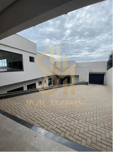 Logo na fachada, o imóvel impressiona com suas linhas retas, volumetria moderna, concreto aparente e amplas esquadrias em vidro, transmitindo solidez e elegância.